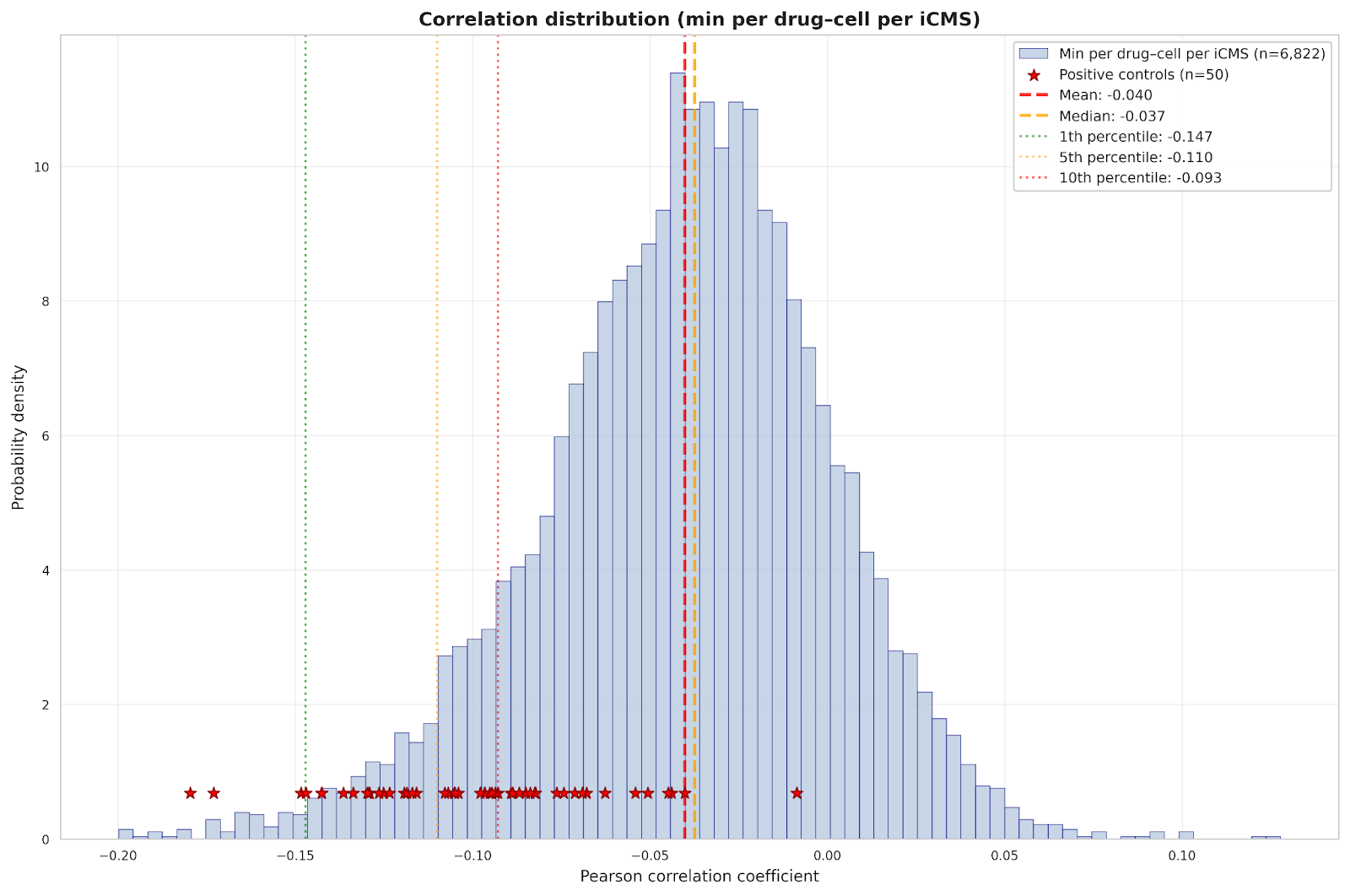 Figure 1: Distribution of Pearson correlation coefficients across all drug–cell line pairs, with positive controls (red stars) clustered in the left tail.